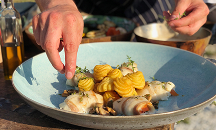 gerecht mee gemaakt heeft, namelijk Saltimbocca van vis met gegrilde groenten en Pom’ Duchesse.