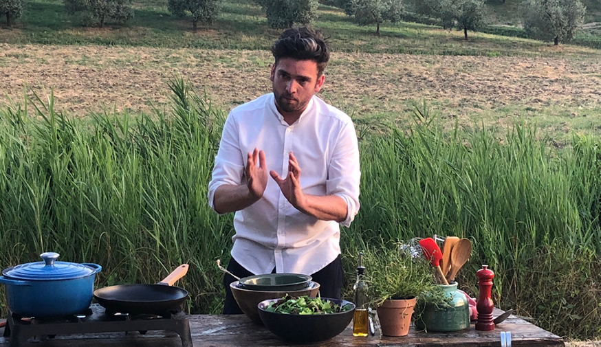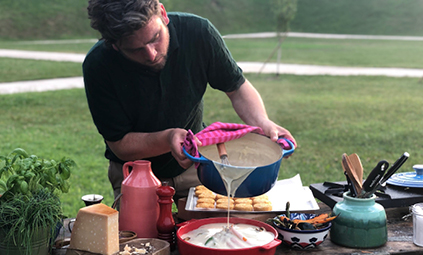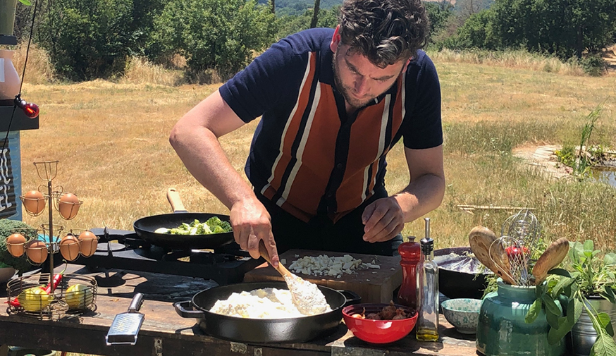 Wim heeft een geweldig gerecht gemaakt met bolcourgettes en pesto gratin. Natuurlijk had Ruggero commentaar op Wims pestorecept. Maar als niet-Italiaan had Wim het er toch aardig afgebracht.