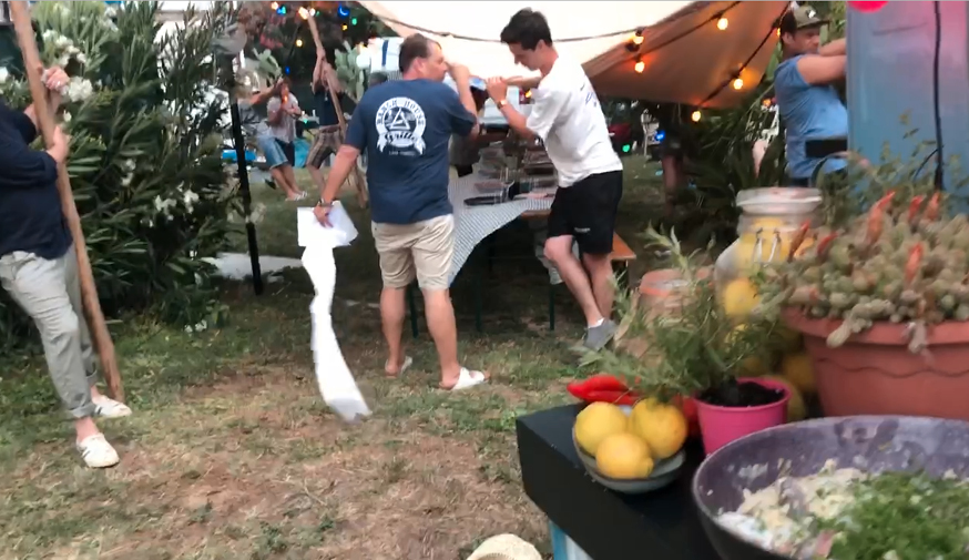 tentpalen vasthouden en iedereen hielp om nog te redden wat er te redden viel aan rondslingerende borden,