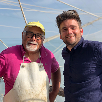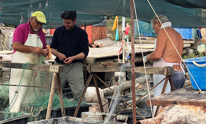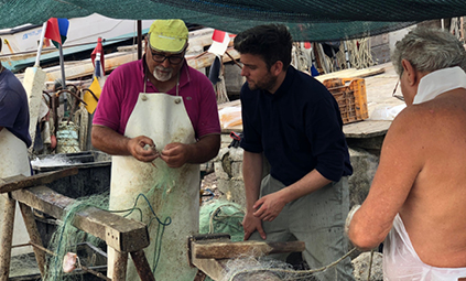 Trabocco op om samen met hem een net uit te gooien. Eerst wilde hij niet want z’n roze shirt was wat niet