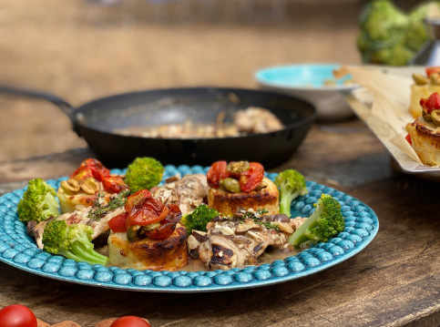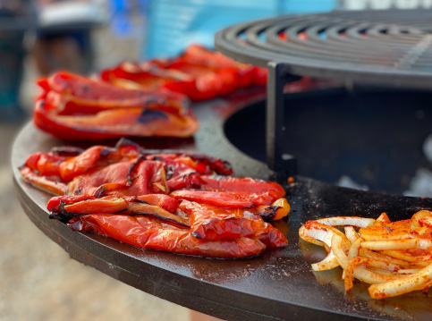 Geroosterde paprika’s met ham aardappelblokjes en romescosaus