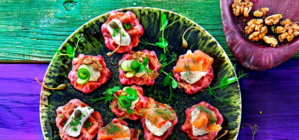 • Deze hartige wafeltjes met prachtig roze kleur, zien er echt fantastisch uit. Lekker om te beleggen met geitenkaas, gerookte zalm of een truffeltopping.