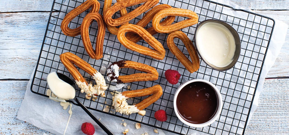 Churros met witte en donkere chocoladesaus, met gehakte hazelnoten en kokosvlokken
