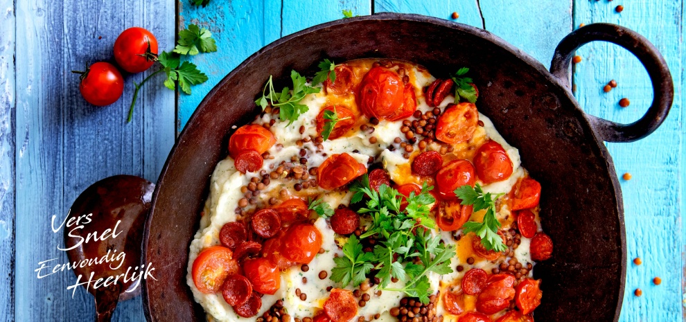 Chorizo-kruidenpuree met tomaatjes, linzen en citroen